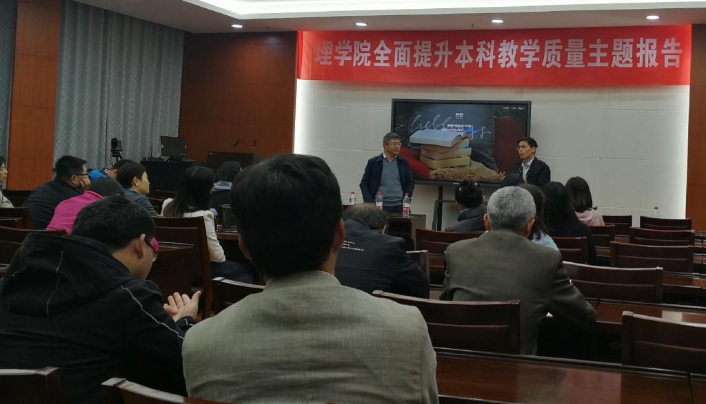 报告会上,陆建隆教授以大学物理学教学为例,讲解了研究性教学大学基础课程的教学实践。陆教授主要讲解了研究性教学的概念与内涵,结合自身教学的实践以及取得的成果,分享了实施好研究性教学的一些建议。报告现场轻松愉悦,会后与会教师就切身经历与陆教授进行了热烈的交流与讨论。