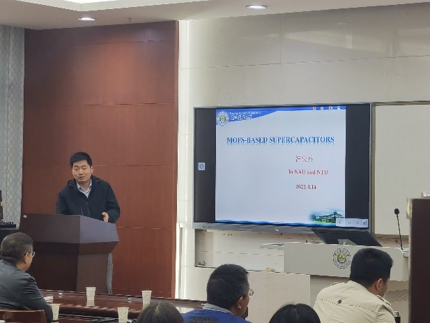 第二位报告人汪快兵副教授作了题为“基于金属有机框架(MOFs)的超级电容器” 的汇报,他介绍了在新加坡国立大学访学期间关于超级电容器的研究工作,阐述了MOFs材料的相关内容,并展开讨论了今后他的研究方向。之后,他介绍了在德赢官网Vwin吴华教授团队进行开展的一系列合作研究,最后他也提及出任学术期刊Frontiers of Chemistry专题编辑,邀请各位老师积极投稿。
