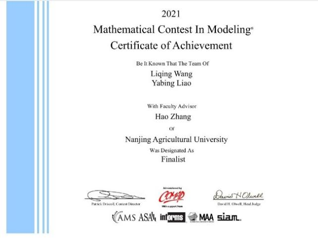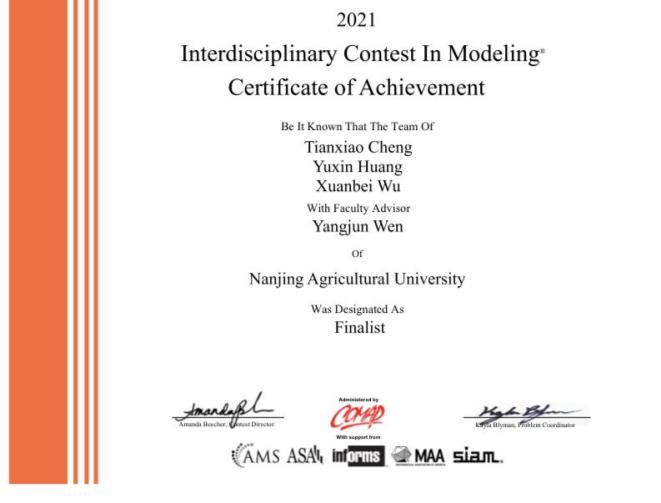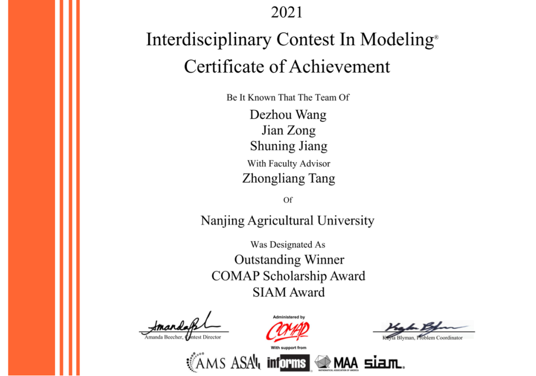 4月24日,2021年美国大学生数学建模竞赛(MCM/ICM)结果正式公布。我校50支参赛队伍,喜获特等奖(Outstanding Winner)1项、特等提名奖(Finalist)2项、一等奖(Meritorious Winner)3项和二等奖(Honorable Mention)12项的成绩,获奖比例高、获奖等级好,其中Outstanding Winner和Finalist两个奖项为我校首次获得,刷新了我校参赛历史的最佳成绩。我校获得Outstanding Winner的参赛队伍同时还获得了COMAP Scholarship(10000美元,每年仅有四支队伍获此殊荣)和SIAM Award(每年仅有六支队伍获此殊荣)。