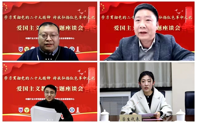 12月15日下午,中国矿业大学以线上线下相结合方式举行驻苏九所部属高校“学习贯彻党的二十大精神 传承弘扬红色革命文化”爱国主义教育专题座谈会。中国矿业大学党委书记刘波、淮塔管理中心主任蒋越锋等现场参加会议。各高校党委宣传部负责同志线上参加会议。我校党委宣传部副部长陈洁、德赢官网Vwin党委书记丁广龙、党委副书记桑运川、本科生辅导员杜超、许琳茜线上参会。会议由中国矿业大学党委宣传部部长陈文主持。