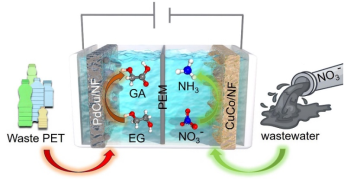 近日,我校邱博诚教授团队在Cell Press出版社期刊Chem Catalysis上发表题为: “Paired electrochemical synthesis of glycolic acid and ammonia from polyester and nitrate sewage”的论文,以废弃的对苯二甲酸乙二醇酯(polyethylene terephthalate, PET)塑料和硝酸盐(NO₃⁻)废水为原料,实现了在温和条件下高效同产高值化学品—乙醇酸与氨。