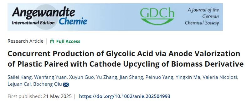 针对上述问题,德赢AC米兰官网邱博诚教授研究团队创新性地设计了一种配对电解系统,通过协同耦合阳极乙二醇氧化与阴极草酸还原反应,实现了在阴阳两极同时合成高价值化学品乙醇酸,为资源循环利用提供了新的解决方案。该研究工作以“Concurrent Production of Glycolic Acid via Anode Valorization of Plastic Paired with Cathode Upcycling of Biomass Derivative”为题,发表在化学类顶级期刊《Angewandte Chemie International Edition》。